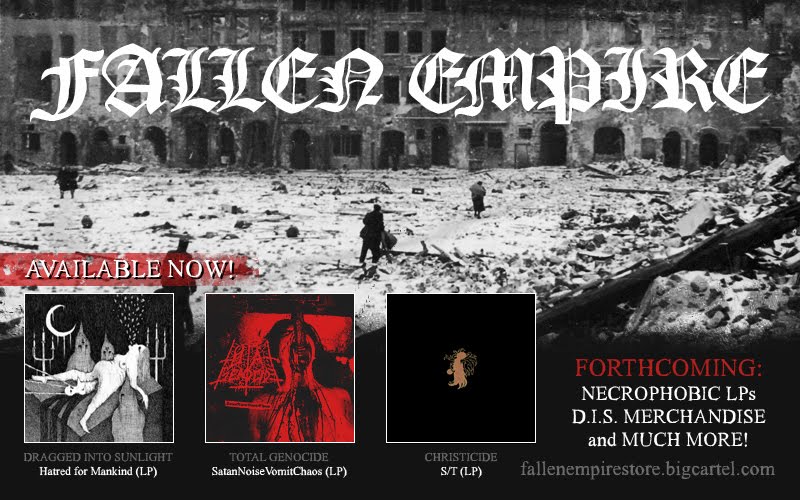 _______________________________________ [Jun 18,2011 2:26pm - Fallen_Empire ""] SHOP IS OPEN! http://fallenempirestore.bigcartel.com/ DRAGGED INTO SUNLIGHT LP available now for MONDAY shipping! Only 7 units left in stock for Monday shipping, so act fast. A reinforcement package will be arriving midweek next week, so any orders after the first 7 (first 3 white, first 4 black) will be shipped once the new package arrives. CHRISTICIDE and TOTAL GENOCIDE LPs will be arriving early next week, so any orders containing those LPs will be held until units arrive. As of right now the parcel is en route to USA from Germany, probably going through customs check. NECROPHOBIC LPs should be arriving late next week and will be posted for sale once I receive confirmation of shipment from HHR. FOR SHIPPING OUTSIDE USA OR CANADA PLEASE E-MAIL ME FIRST! Any other questions e-mail fallen.empire13@gmail.com, always open for correspondence. |